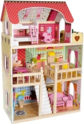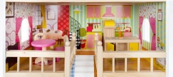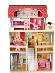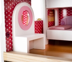 La maison est équipée de trois niveaux reliés par des escaliers blancs, cinq pièces et un balcon, idéal pour jouer avec toute la famille de poupées.