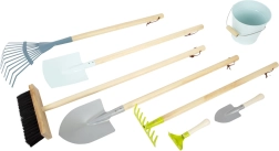 Manches en bois et parties de travail en métal résistent à l’usage quotidien des enfants au jardin, dans le bac à sable ou dans la cour.