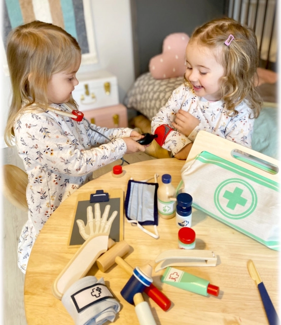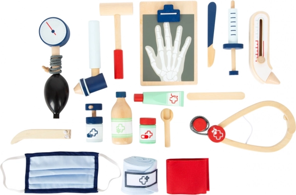 Inclus, un riche assortiment d’accessoires : stéthoscope, thermomètre à température réglable, seringue avec mécanisme mobile, otoscope avec véritable loupe, mais aussi tensiomètre avec brassard et poire, désinfectant avec pompe, flacons, cuillère, pince, scalpel, marteau réflexe et masques en textile. Les enfants peuvent soigner un « patient », apprendre les bases des soins et réduire la peur de rendre visite au médecin.