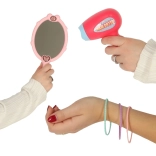 • Riche ensemble d’accessoires : miroir, peigne, “sèche-cheveux” pour enfants, barrettes, bagues, bracelets, autocollants et flacons imitant vernis à ongles et parfums.