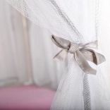 Six entrées avec voilages clairs et semi‑transparents peuvent être remontées et nouées avec des rubans. Les enfants bénéficient de suffisamment de lumière, d’air et d’un sentiment de sécurité.