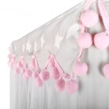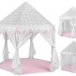 Le tapis spacieux et les parois aérées assurent le confort pour un ou plusieurs enfants – on y place aisément des coussins, peluches et livres. La tente convient parfaitement à l’intérieur comme au jardin sous la surveillance d’un adulte. Les pompons décoratifs et la possibilité de nouer les voilages apportent style au jeu et préservent l’intimité.