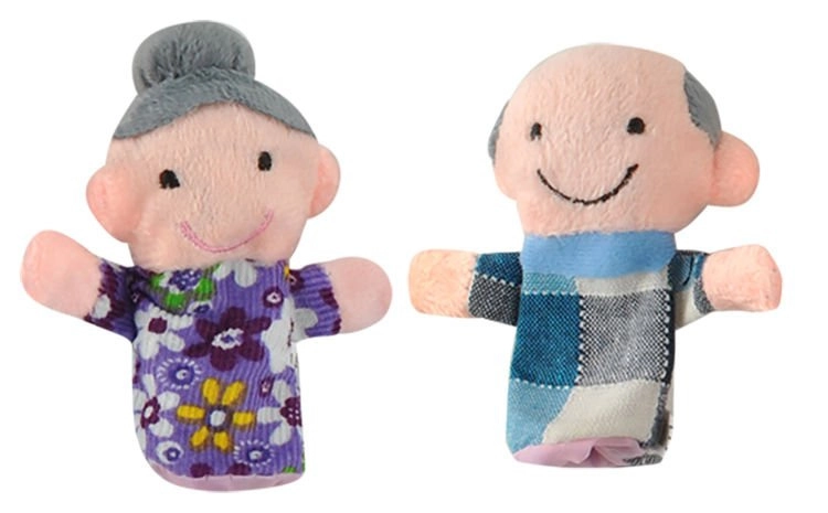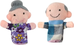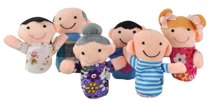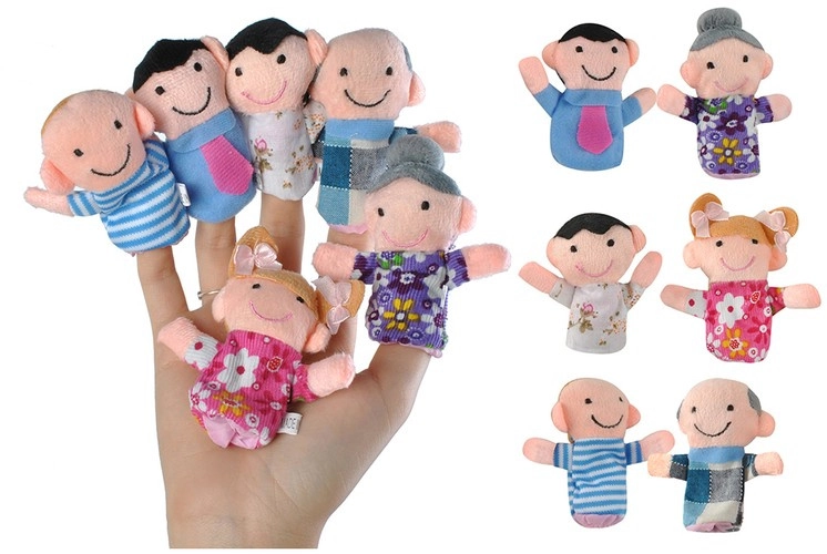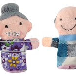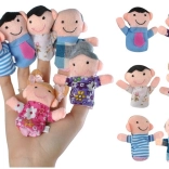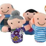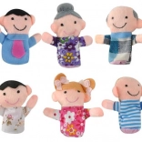 Six marionnettes – maman, papa, fils, fille, grand-mère et grand-père – permettent de développer intrigue, rôles et coopération entre enfants.