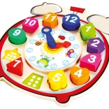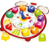 Ce jouet éducatif multifonction en bois combine un jeu d’encastrement et une horloge. Les pièces colorées de différentes formes, numérotées, s’insèrent dans les ouvertures correspondantes et des points sont indiqués sous les pièces pour faciliter l’orientation et les premiers dénombrements. Les aiguilles des heures et des minutes, rotatives, aident les enfants à comprendre le principe de la mesure du temps de manière ludique et visuelle.