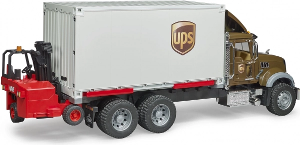 Le camion Bruder Mack UPS offre de nombreuses fonctions qui simulent un véritable véhicule de transport. Grâce aux portes ouvrantes de la cabine et de l'espace de chargement, vous pouvez facilement manipuler l'intérieur du modèle. Avec le chariot élévateur intégré, qui dispose de fourches variables pour différents types de chargement.