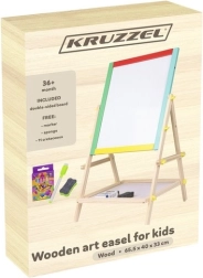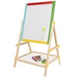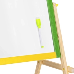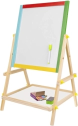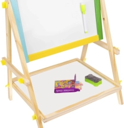 Tableau double face en bois pour enfants avec une face noire à craie et une face blanche effaçable à sec, qui stimule la créativité, l’apprentissage et la motricité fine. Le cadre coloré est en bois finement travaillé, et la structure stable est complétée par une étagère pratique pour les accessoires. Le coffret comprend un marqueur, une éponge et des craies – prêt à l’emploi immédiatement.
