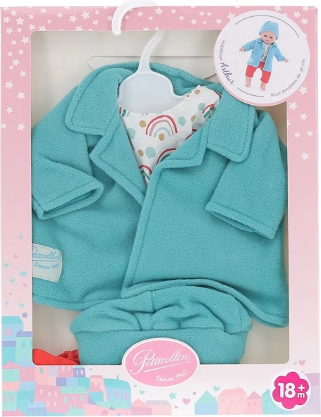 Une tenue stylée pour poupée 36 cm de la marque Petitcollin, design Arthur : sweat polaire turquoise, blouse à motifs, short rouge et petit bonnet. Finition de qualité, élégance française et couleurs vives stimulent l’imagination et la joie du jeu, tandis que l’habillage facile convient même aux petites mains.