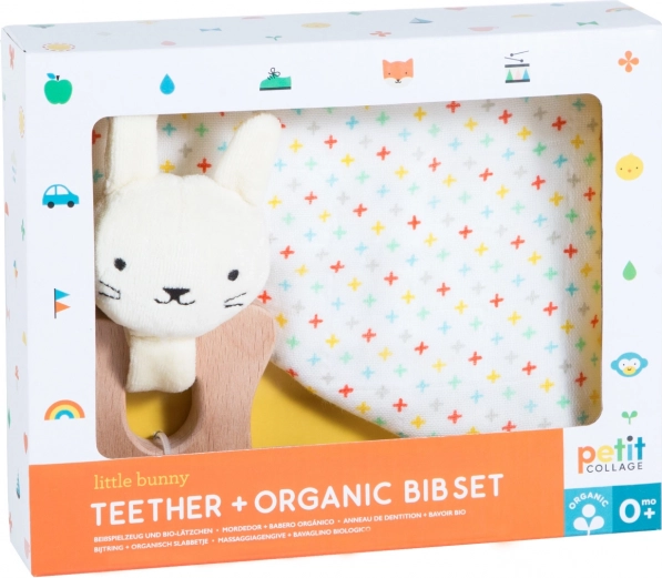 Le hochet de dentition et le bavoir sont fabriqués en coton biologique et en bois certifié FSC.