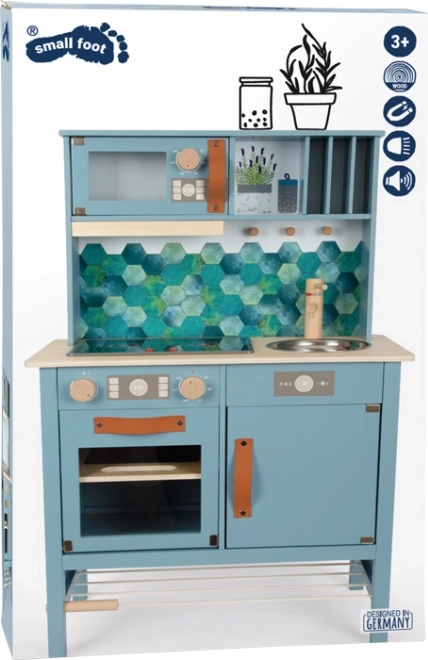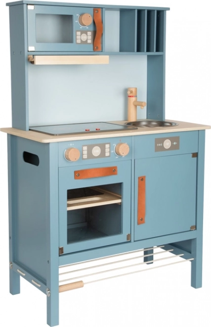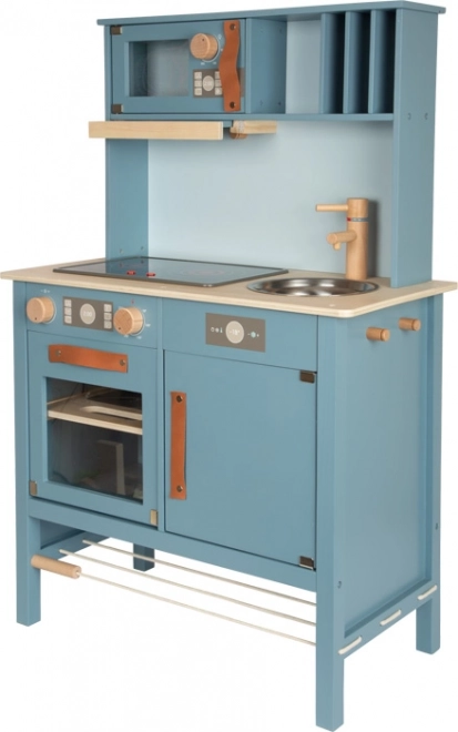 La cuisine pour enfants en bleu fumé avec des poignées en cuir élégantes offre une impression de cuisine réaliste.