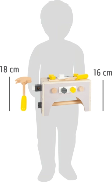 Marteau, clé, tournevis, pince étau et étau – le tout en bois robuste. Les enfants s’initient de manière ludique aux compétences « artisanales » de base.