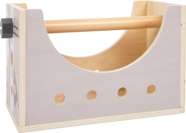 Le set comprend 5 outils en bois – marteau, clé, tournevis, pince étau et étau – ainsi que de nombreux éléments pour des projets créatifs. La poignée amovible et les ouvertures pratiques permettent de tout ranger rapidement, ce qui rend la caisse idéale pour les voyages.