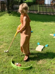 - 3 clubs de golf de longueurs différentes, balles souples, obstacles (vague, balançoire, tunnel, etc.), sac pratique