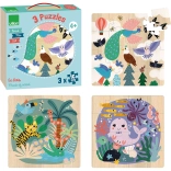 Ensemble de 3 puzzles en bois magnifiquement illustrés, représentant des scènes de la mer, de la terre et du ciel. Les illustrations sont signées Michelle Carlslund, célèbre illustratrice danoise.