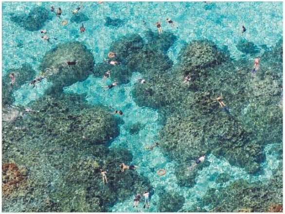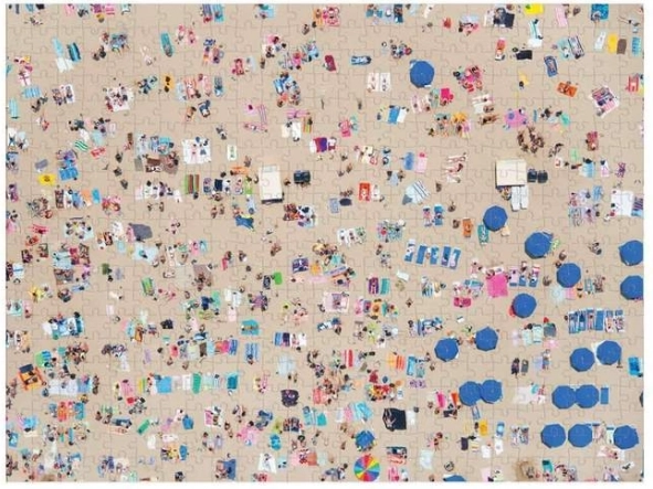Ce puzzle recto-verso stylé, inspiré des photographies aériennes emblématiques de Gray Malin, offre un défi attrayant et un résultat décoratif. Un côté capture une plage animée en vue aérienne, l’autre la surface calme de l’océan avec rochers et nageurs. Grâce aux finitions opposées (brillant/mat), vous identifiez facilement la face en cours d’assemblage.