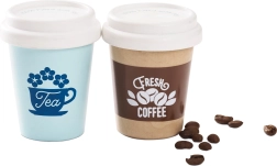 Deux gobelets finement réalisés « Fresh Coffee » et « Tea » avec couvercles blancs apportent une touche authentique aux jeux de café comme aux coins thé.
