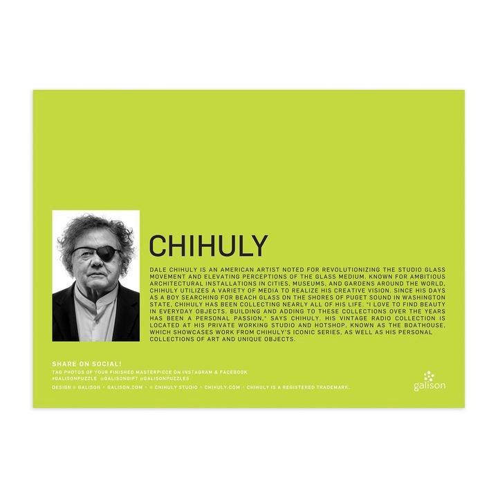 Un puzzle stylé au motif de radios portatives vintage qui ravira les amateurs de design et les collectionneurs. L’artiste Dale Chihuly s’est inspiré de sa collection de toute une vie, donnant naissance à une image riche en détails et en couleurs. L’impression de haute qualité et les pièces solides en papier recyclé garantissent un agréable moment à chaque séance d’assemblage.