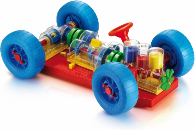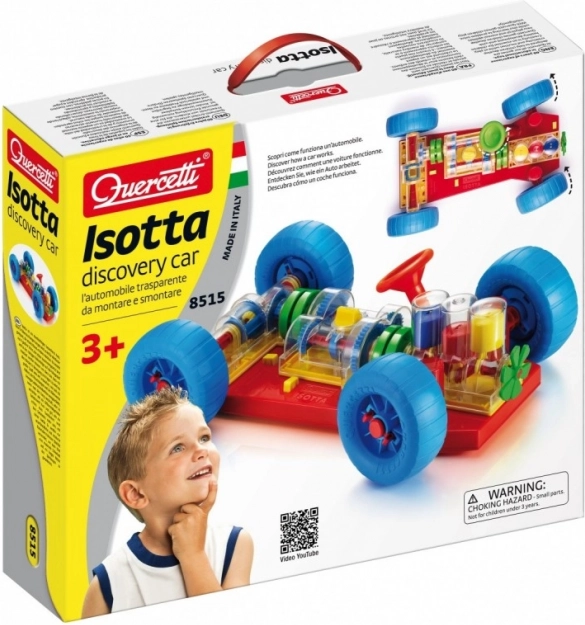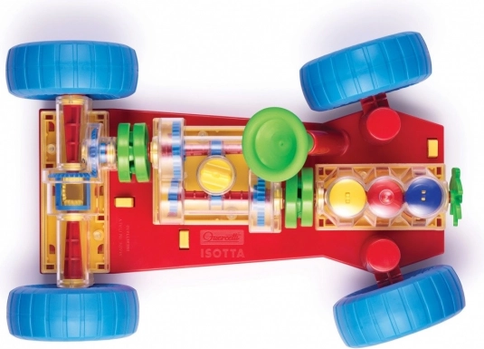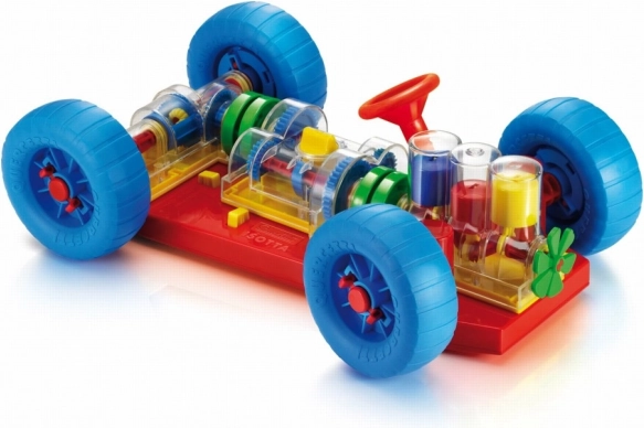 Un jouet ingénieux qui incite directement les enfants et leurs parents à découvrir le fonctionnement d’une vraie voiture. Toutes les fonctions mécaniques de base y sont fidèlement reproduites. Au niveau du moteur, les enfants verront comment travaillent les cylindres et le vilebrequin et comment ils sont reliés à la boîte de vitesses, qui propose un changement fonctionnel à 3 positions (point mort, 1re et 2e vitesse). Le différentiel transmet le mouvement aux roues arrière et permet leur rotation indépendante. Toutes les pièces mécaniques peuvent être facilement fixées au châssis et aussi libérées grâce à des boutons jaunes spéciaux à ressort. Le volant est fonctionnel et permet à la voiture de tourner ou de se garer. Les enfants peuvent également soulever la voiture à l’avant et à l’arrière à l’aide de chariots spéciaux et, en tournant la manivelle de celui de l’avant, mettre tout le mécanisme en mouvement. En passant les différents rapports, ils verront la vitesse des roues et des cylindres changer. En engageant le point mort, ils remarqueront aussi comment le moteur et le différentiel se désaccouplent. Destiné aux enfants à partir de 3 ans. Caractéristiques principales : les fonctions mécaniques de base sont reproduites, volant et pièces mécaniques fonctionnels, pour les enfants dès 3 ans