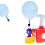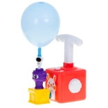 1× pompe manuelle/lanceur, 2× petites voitures, 1× crabe, 1× chenille, 1× astronaute, 1× fusée, 1× sifflet volant, 2× valve de rechange, 12× ballons