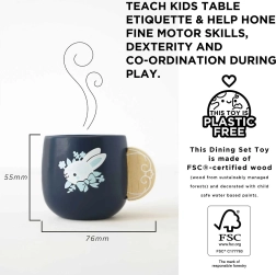 Ce service de table pour enfants de haute qualité est conçu pour durer tout en étant esthétique dans toute chambre d’enfant. Des motifs bleu et blanc élégants avec des illustrations végétales, des surfaces en bois lisses et des peintures à base d’eau sûres en font un choix idéal pour le jeu quotidien.