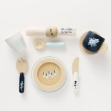 Tasse, soucoupe, gobelet, 2 assiettes, couverts et serviette avec anneau – tout ce dont les enfants ont besoin pour servir et s’entraîner aux bonnes manières à table.