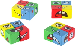 Des cubes finement poncés avec des impressions d’yeux et de bouches permettent de composer des dizaines d’expressions. Solides, sûrs et agréables en main.