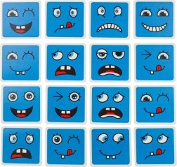 - 16 cubes en bois en 4 couleurs, 64 cartes d’expressions