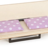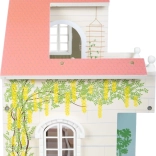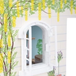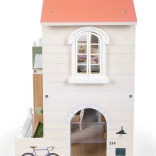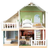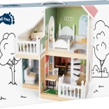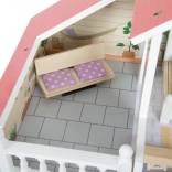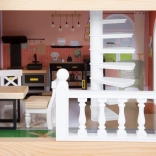 Élégante maison de poupées en bois avec façade ouverte offrant trois pièces, une terrasse et un petit jardin pour un jeu réaliste. Inclut un escalier en colimaçon, des fenêtres ouvrantes, une salle de bain moderne avec paroi en plexi et 8 éléments de mobilier fonctionnel avec accessoires textiles. Sa conception compacte et stable au design clair et moderne est idéale pour la chambre d’enfant comme pour le salon.