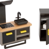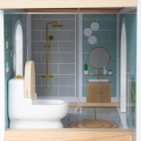 Inclus, 8 pièces de mobilier et des détails pratiques pour un jeu authentique : toilettes ouvrantes, placards de cuisine et réfrigérateur avec portes ainsi que des tiroirs. Des coussins et une parure de lit textiles apportent de la chaleur à la chambre, tandis que l’escalier en colimaçon relie les deux niveaux au sein d’un intérieur bien pensé avec paroi de douche en plexi.