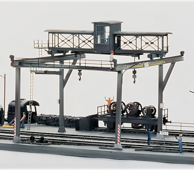 La grue portique PIKO enrichit votre réseau d’un élément industriel marquant. Grâce à sa structure élaborée pleine de petits détails, elle convient aux modélistes exigeants, qui apprécieront la coloration fidèle avec patine et la large plateforme pour l’aménagement des abords. Elle se prête parfaitement aux scènes de cimetière de locomotives, aux zones de transbordement ou autres environnements industriels.