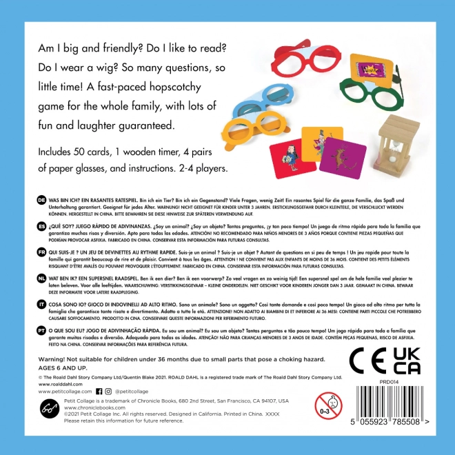 "Qu'est-ce que c'est ? Jeu à thèmes de Roald Dahl" de Petit Collage vous transporte dans le monde magique des personnages littéraires à l'aide de lunettes amusantes et de cartes illustrées. Dans ce jeu amusant, les joueurs peuvent tester leurs connaissances sur les personnages favoris à travers des questions et des réponses. Le jeu est conçu pour 2 à 4 joueurs et est idéal pour des moments en famille.