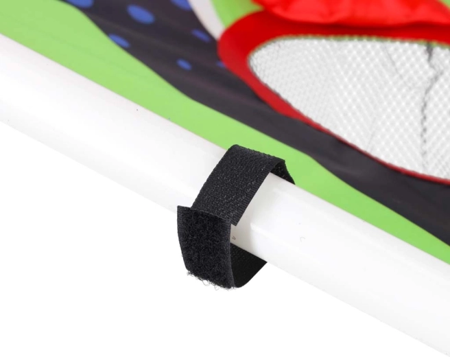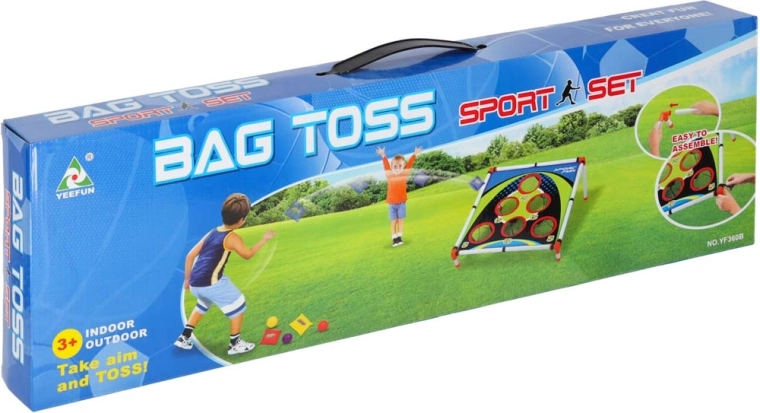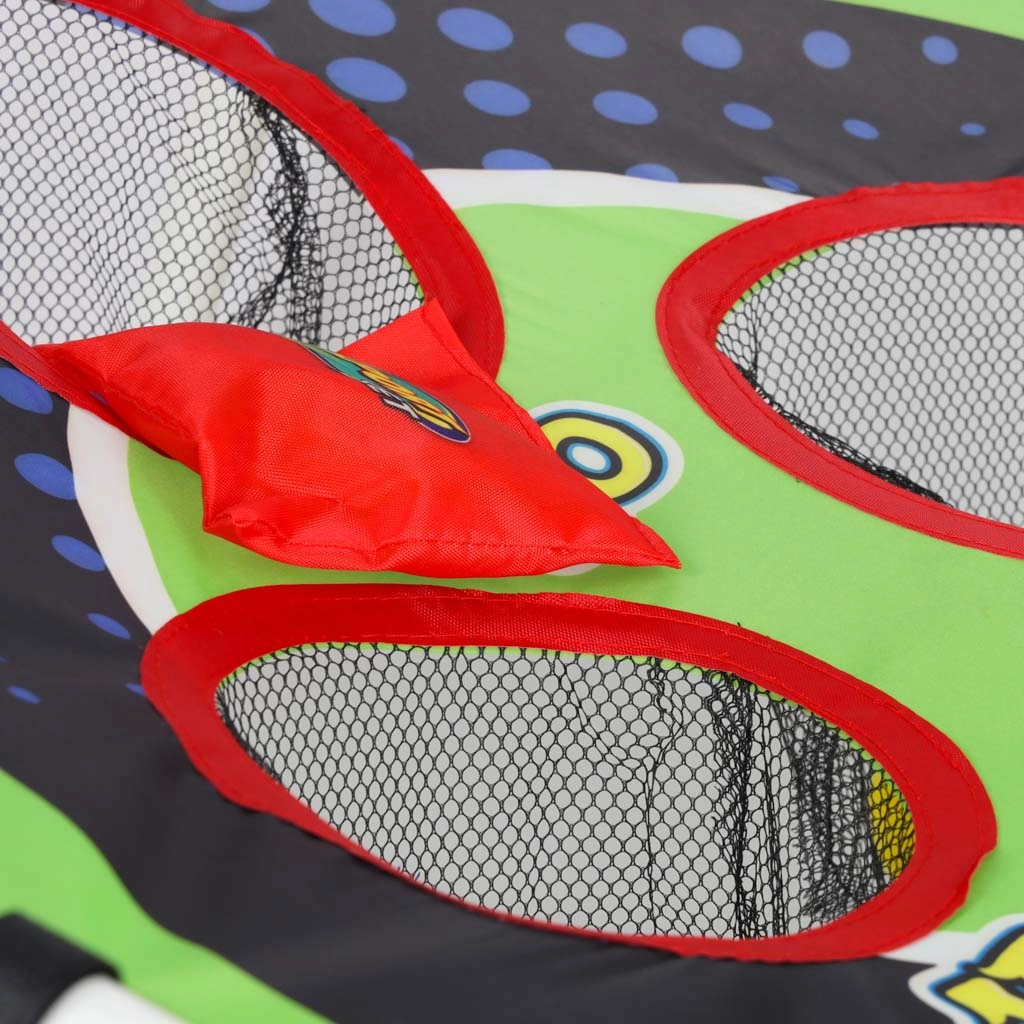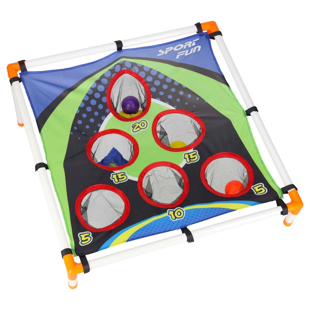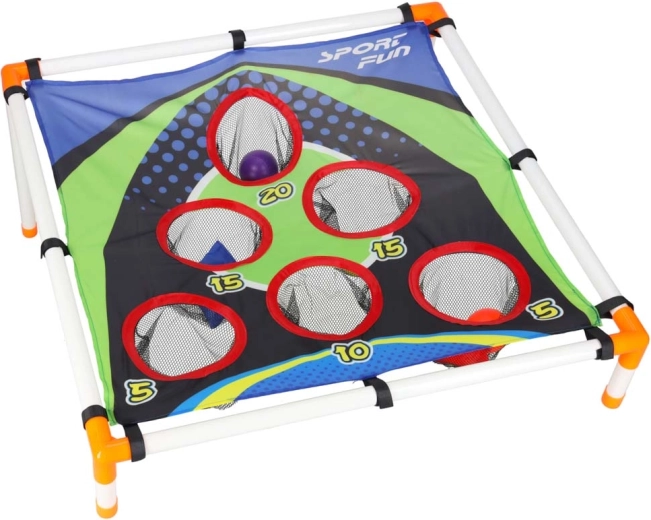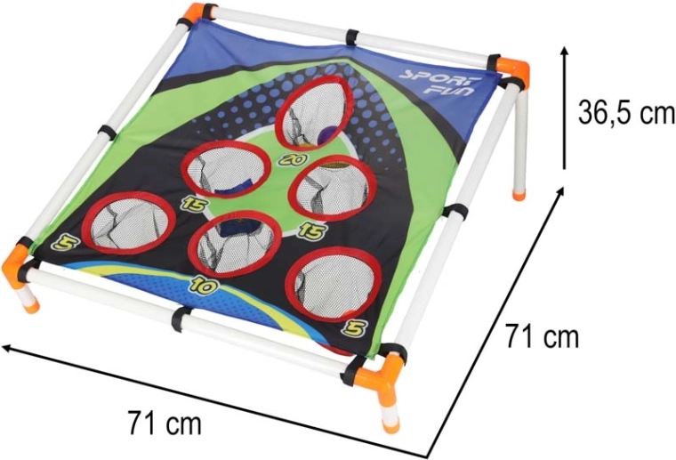 La structure légère en tubes plastiques avec support incliné assure la stabilité, la surface textile robuste avec cinq à six ouvertures comptabilisées retient les sachets et les balles dans des filets. Le montage est intuitif et l’ensemble du jeu se transporte aisément partout.