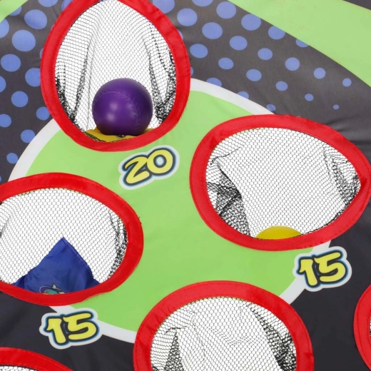 La cible avec plusieurs ouvertures marquées 5, 10, 15 et 20 points motive les enfants à améliorer leur précision et à créer leurs propres règles de compétition.