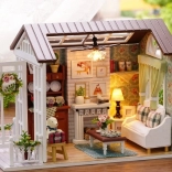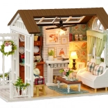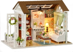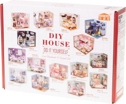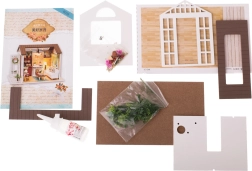 Le set contient tout le nécessaire pour la construction du salon et son aménagement, y compris de la colle et des instructions illustrées détaillées. L’éclairage LED, inclus dans l’emballage, fonctionne avec des piles (2x AAA 1,5 V et 3x LR54 1,5 V – piles non incluses) et sublime magnifiquement l’ambiance générale.