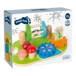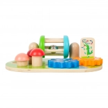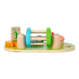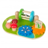 La planche en bois offre différents éléments mobiles comme des engrenages et des boutons à tirer pour développer la motricité fine.