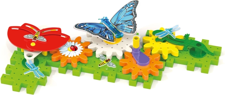Le kit de construction Quercetti Jardin en mouvement apporte un apprentissage ludique par le jeu. Les enfants relient les roues dentées, créent leurs propres mécanismes et découvrent les principes de transmission du mouvement. En tournant la manivelle, tout l’univers coloré s’anime – les fleurs s’ouvrent, les papillons battent des ailes et les petites bêtes se mettent en mouvement.