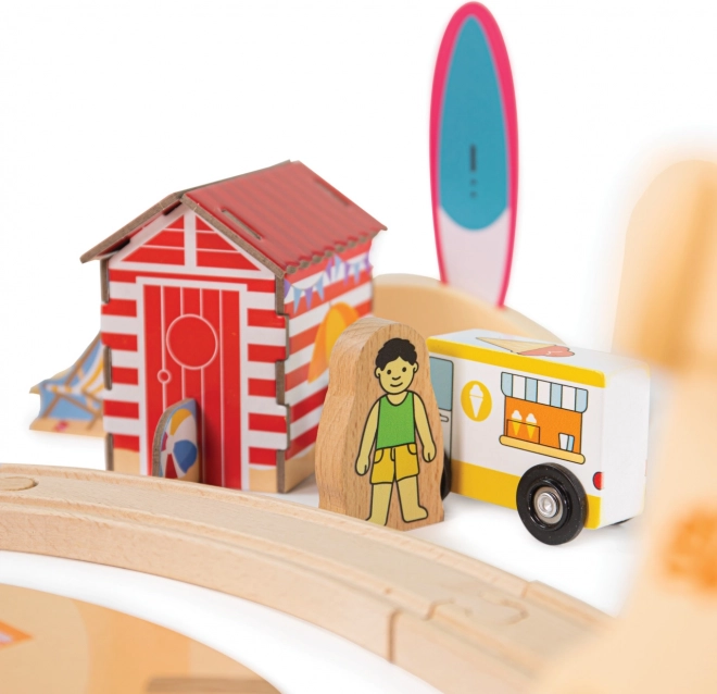 Partez pour un littoral ensoleillé avec ce circuit de train en bois à thème et apprenez aux enfants à prendre soin de la nature. Le set comprend 70 pièces, dont un train en 3 parties, des petites voitures, un château de sable avec passage et des cabanes de plage. Des panneaux magnétiques pour le tri des déchets sont inclus, favorisant la motricité fine, les compétences cognitives et une démarche de jeu durable.