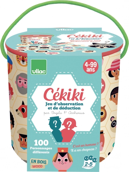 VILAC CÉKIKI est un jeu vif d’observation et de devinettes avec des personnages originaux de l’illustratrice suédoise Ingela P. Arrhenius. Disposez les pièces en bois illustrées sur la table et essayez deux modes de jeu : soit vous devinez le personnage secret à l’aide de questions astucieuses, soit vous cherchez le plus vite possible l’image identique à celle de la carte retournée.