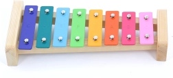 Xylophone avec lames métalliques arc-en-ciel sur socle en bois. Chaque lame est marquée d’une note, ce qui facilite l’apprentissage de la musique.