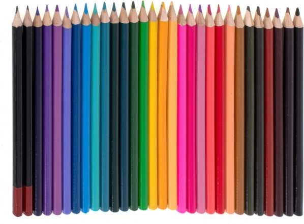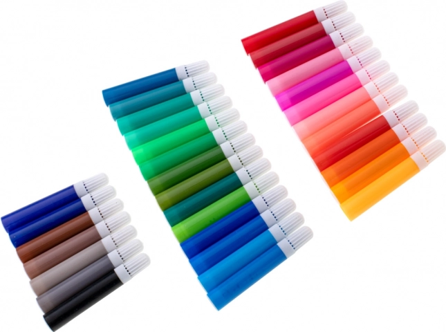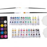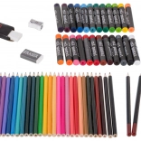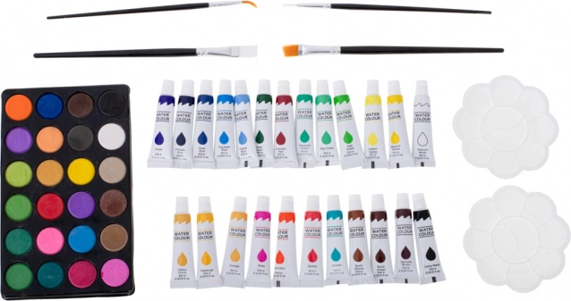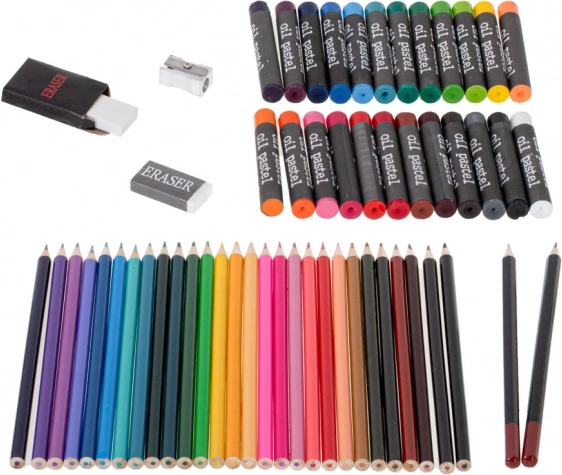 - 33× feutre, 28× crayon de couleur, 4× pinceau, 2× crayon, 2× gomme, 2× palette en plastique, 1× taille-crayon, palette de 24 aquarelles, 24× peinture en tube, 24× pastel à l’huile, mallette