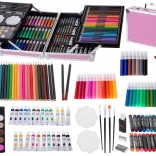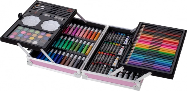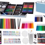 - Équipement complet 145 pcs : feutres, crayons de couleur, pinceaux, crayons, gommes, aquarelles, peintures en tube, pastels à l’huile, palettes et taille-crayon.