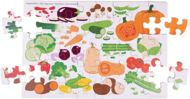 Le puzzle inclut divers types de légumes comme des citrouilles, poivrons et carottes, et apprend aux enfants la nutrition et un mode de vie sain.