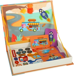 Ce puzzle magnétique transforme chaque ouverture du « livre » en un voyage ludique dans le monde des transports. Il suffit d’ouvrir le couvercle avec tableau magnétique, de choisir une carte-modèle ou de faire appel à son imagination pour composer à partir des aimants colorés ses propres véhicules et scènes. Les enfants s’amusent à créer un camion de pompiers, une ambulance, un autobus, un taxi, une voiture de police, un camion, un bateau et une fusée – et bien d’autres combinaisons.