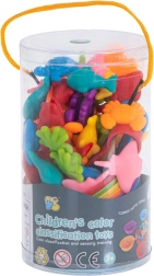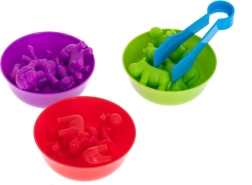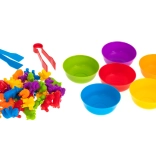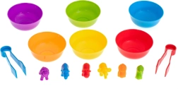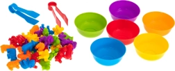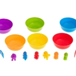 Six bols de différentes couleurs et 36 figurines permettent aux enfants de trier, additionner et comparer – idéal pour les premières activités mathématiques.