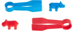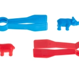 Deux pincettes pour enfants favorisent une prise correcte et la coordination œil-main lors du déplacement des animaux entre les bols.