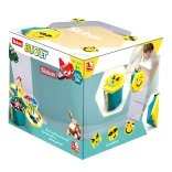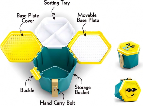 - Seau pratique – le couvercle sert de plaque de construction et l’intérieur comporte un compartiment pour trier les pièces.