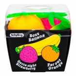 Trois balles en forme de banane, de fraise et d’orange aux couleurs vives offrent une stimulation visuelle et tactile.