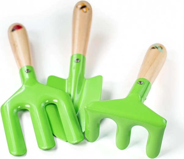 Chaque pièce est pensée pour les petites mains : les poignées en bois lisses tiennent agréablement en main, les parties métalliques sont résistantes et les gants en tissu protègent pendant l’activité. Le set est parfait pour jouer au jardin comme dans le bac à sable, et grâce à son emballage compact, tout est toujours à portée de main.