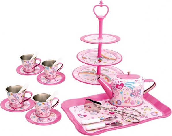 C’est l’heure d’un thé magique ! Ce riche service à thé pour enfants offre tout le nécessaire pour un moment de table ludique avec les parents, les poupées et les peluches. L’ensemble est finement décoré, fabriqué en métal léger et résistant et en plastique sûr, et développe l’imagination, la coopération et les compétences de communication. Il comprend un service pour 4 personnes et au total 35 pièces, dont un présentoir à étages pour les sucreries.