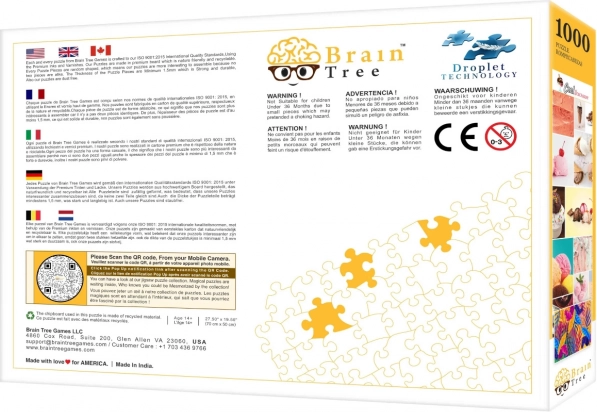 La boîte contient tout le nécessaire pour un assemblage confortable : un poster de même qualité que l’image du puzzle, plusieurs intercalaires en carton pour trier, un support pour le couvercle de la boîte pour une meilleure visibilité et, pour l’ensemble 1000 pièces, un sachet à zip résistant pour un stockage sécurisé des pièces.