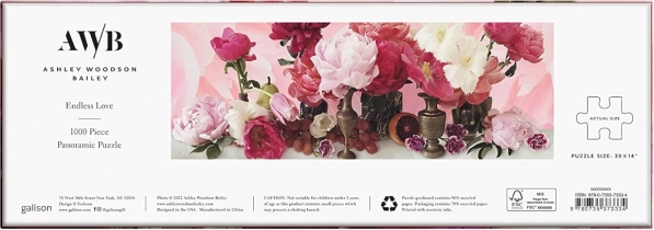 Profitez d’un moment de détente avec le puzzle panoramique au motif Endless Love par ASHLEY WOODSON BAILEY. Ce puzzle de 1000 pièces haut de gamme de GALISON, en papier recyclé, offre une impression de qualité supérieure avec des encres sûres, une finition mate pour des couleurs fidèles sans reflets et un motif floral soigneusement sélectionné inspiré des natures mortes hollandaises.